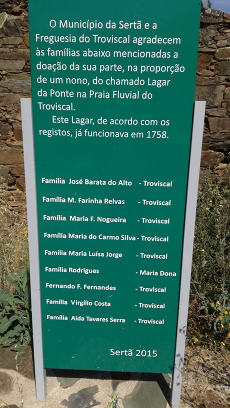 O Município da Sertã e a Freguesia do Troviscal agradecem às famílias abaixo mencionadas a doação da sua parte, na proporção de um nono, do chamado Lagar da Ponte na Praia Fluvial do Troviscal. Este Lagar, de acordo com os registos, já funcionava em 1758.